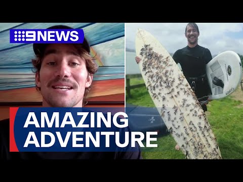 A Tasmanian man's surfboard has turned up covered in barnacles bobbing in the waves in New Zealand 18 months after...
