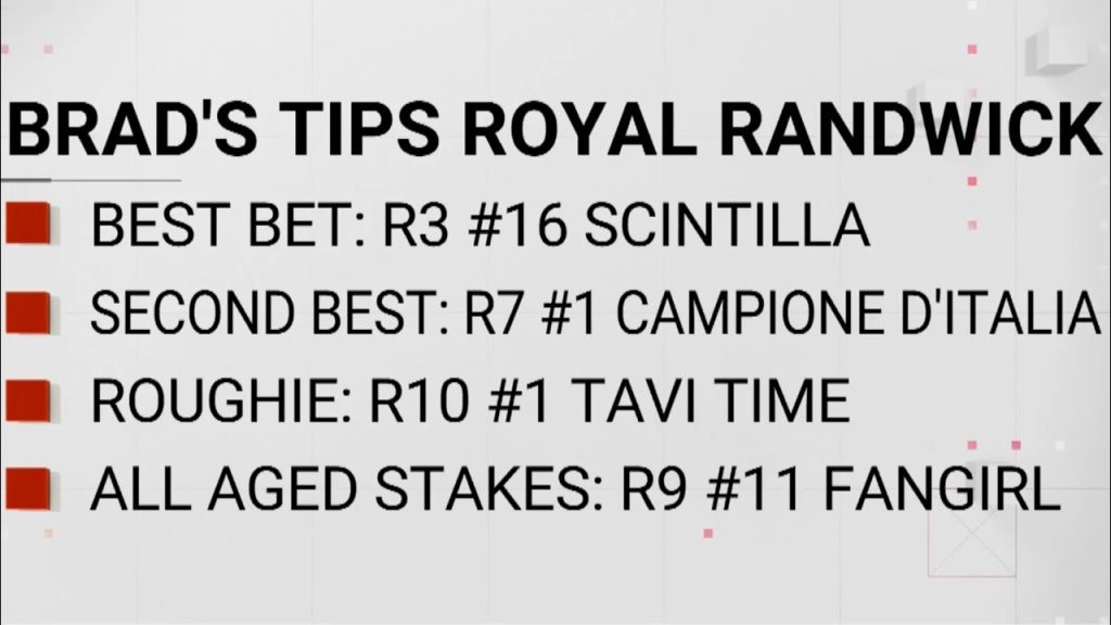 Sky News Brad Gray’s top tips for Randwick on Saturday 2 hours ago The News Room Racing analyst Brad Gray provides his top tips for Randwick Racecourse on Saturday. BEST RACE: R3 #16 SCINTILLA SECOND BEST: R7 #1 CAMPIONE D’ITALIA ROUGHIE: R10 #1 TAVI TIME ALL AGE STATES: R9 #11 FANGIRL In partnership with Racing NSW. Post navigation Previous How long until consumer prices stabilise with Hormuz reopened? | ABC NEWSNext Ben Roberts-Smith released on strict bail conditions | 7NEWS